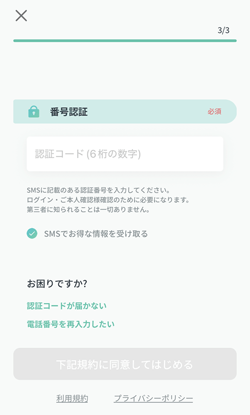 次に、あなたの電話番号を使って本人確認をします。SMSに届いた番号を入力するだけなので、とってもかんたんです。