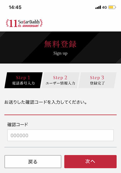 まずは公式サイトの「無料登録」ボタンを押して、あなたの電話番号を入力します。