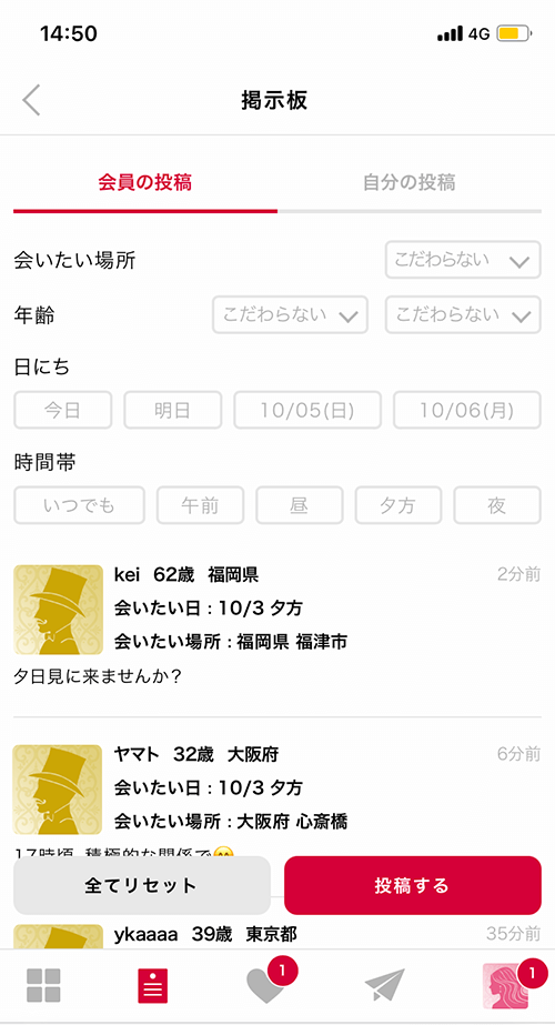 - 掲示板機能:「今日これから会える人いませんか?」みたいに、急な出会いを募集することもできますよ。